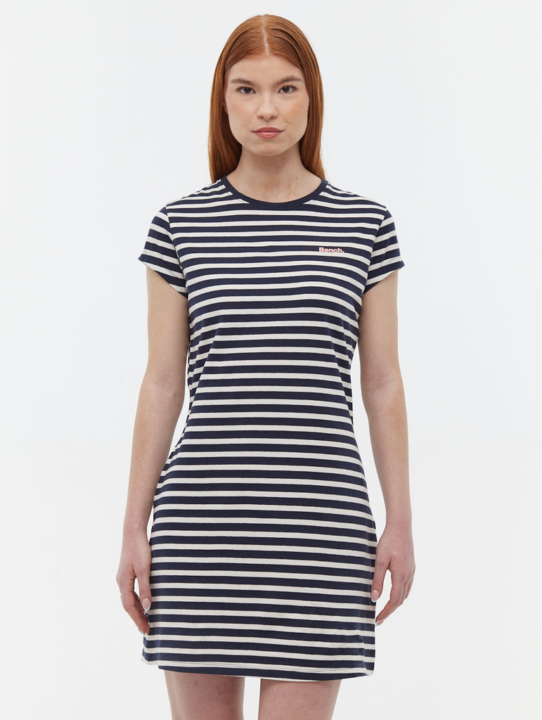 The Mabelle Striped T-Shirt Midi Dress by Bench blends nautical style with everyday ease. Made from breathable fabric, it features classic horizontal stripes, a relaxed fit, and a ribbed crew neckline. A small chest logo adds subtle branding. Perfect for layering or solo wear, it's effortlessly versatile.